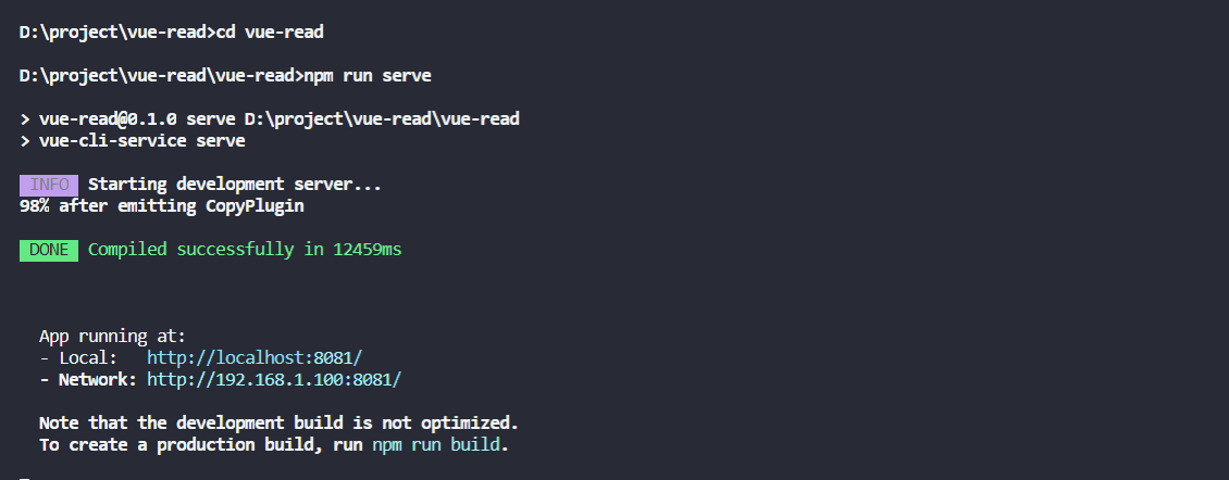 4.2 进入项目,并执行npm run serve