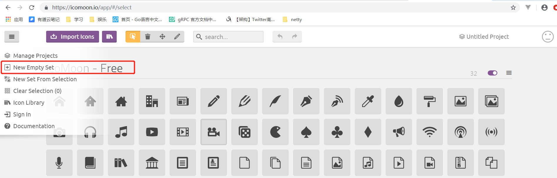 2,进入https://icomoon.io/app网站 创建一个空集合