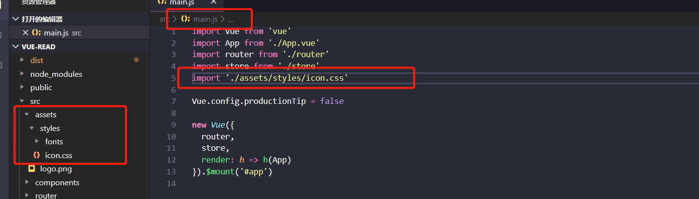 5,将文件拷贝的工程的目录下,并在main.js中引入图标